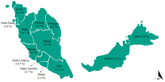 Location and percentage of surveyed houses in Malaysia. Image from [36].