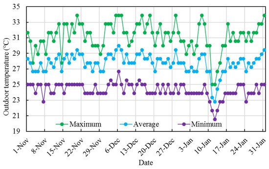 Figure 2 shows the daily average, maximum, and minimum outdoor temperatures during the field survey. This information was obtained from the weather station in Sultan Abdul Aziz Shah Airport, Selangor, Malaysia [35]. The outdoor temperature might be a little different for other locations. However, Malaysia experiences a hot and humid climate throughout the year therefore the monthly outdoor temperature means is almost constant in most of the towns [19]. December 2017 had the highest average outdoor temperature (28.4 °C) and January 2018 had the lowest average outdoor temperature (27.2 °C). The average outdoor temperature for all days was 27.8 °C with a standard deviation of 1.2 °C.