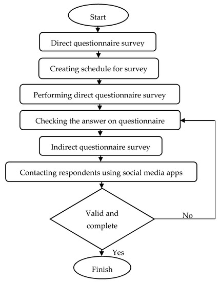 The questionnaire survey was based on one developed by the Jyukanko Research Institute (JRI) [37] and modified by the lead author to meet the objectives of this research. The questionnaire was in English with a Malay translation. The questionnaire surveys were divided into two stages such as direct and indirect. The direct questionnaire surveys were conducted based on the appointed schedule between the lead author and respondents. The surveys were performed by disseminating the questionnaire then all respondents would fill up the questionnaire based on guidance from the lead author. The lead author explained each question and used pictures in some difficult questions to ease the respondents in their answers. After finishing the direct questionnaire survey, the lead author would check the answer. The lead author would conduct an indirect questionnaire survey in order to investigate some illogical questions or answers by confirming to the respondent’s parents or other household members. The lead author used social media apps so that the respondents could confirm unanswered questions and uncleared answers with the person who knows best for the answer. After the family member informed the required information, the respondent would give it to the lead author using social media apps. If the lead author still found an invalid and incomplete answer on the questionnaire, the author would contact the respondent using social media apps through an indirect questionnaire survey and otherwise. Figure 3 shows the flowchart of a direct and indirect questionnaire survey.