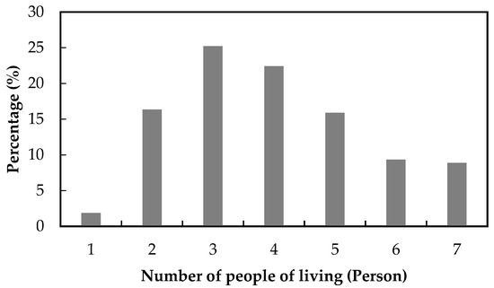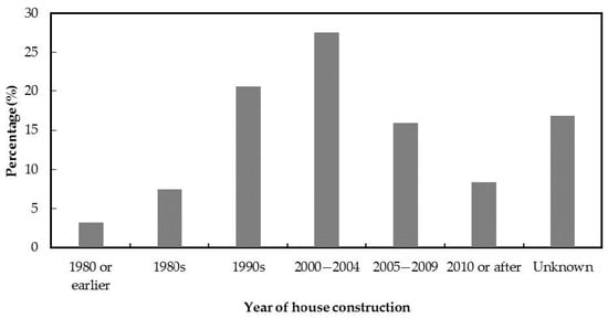 Figure 4 shows the number of people living with a percentage of households. The majority of households had people living in the house between three persons (25.2%) and four people (22.4%). Only 1.8% of the household which had one person living in the house. Figure 5 shows the year of house construction with the percentage of households. Most of the surveyed houses were constructed from 2000 to 2004 (27.6%) and the 1990s (20.6%). The minority of the house was built in 1980 or earlier (3.3%) and only 8.4% of the house were established in 2010 or after.