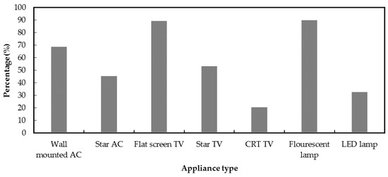 Figure 6 shows the ownership of the appliance type for the household involved in the questionnaire survey. Most households used fluorescent lamps (89.7%) while only 32.7% of households used LED lamps in the house. Flat-screen TVs were used by 89.3% of households with the ownership of energy star TVs at 53.3%. Only 20.6% of households used CRT TV in their house. On the other side, wall-mounted ACs were owned by 68.7% of households, and 45.3% of households utilized star ACs.