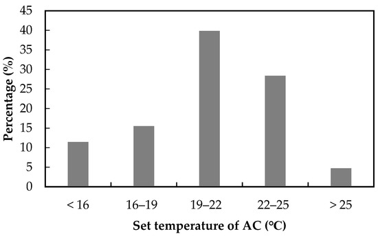 Figure 7 shows the set temperature of air conditioners variation with the percentage of households. The majority of households set the temperature somewhere between 19.1 °C and 25 °C (68.4%). These findings were similar to those found by Jaffar et al. [28] and Kubota et al. [19].