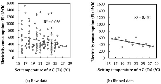 The binned data were analyzed using weighted regression analysis in order to investigate the trends in scattered plots of raw data. The coefficient of determination of binned data was much higher compared to raw data as shown in Equations (2) and (3) for the set temperature of air conditioners as an explanatory variable (Ts), the number of samples (n), coefficient of determination (R2), standard error of regression coefficient (S.E), statistically significant value for regression coefficient (p), and electricity consumption as dependent variable (E), respectively. The slope and constant of raw data and binned data were similar and thus either of the equations can be used to estimate the average electricity use. However, the raw data could be used to show the actual set temperature of air conditioners in daily life.