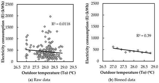 Figure 9 shows the variation in electricity consumption with outdoor temperature based on raw data and binned data. The regression model of binned data at 0.2 °C intervals shows a much higher coefficient of determination than that of raw data as shown in (4) and (5) for the outdoor temperature as an explanatory variable (To), number of the sample (n), coefficient of determination (R2), standard error of regression coefficient (S.E), statistically significant value for regression coefficient (p), and electricity consumption as dependent variable (E), respectively. The slope and constant of binned data were slightly higher than the raw data. This might be due to the small range of outdoor temperature which needs to consider in further studies.