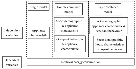 Five multiple linear regression models were constructed in single, double combined and triple combined models as shown in Figure 10. The single model consisted of appliance characteristic factors. The double combined models consisted of socio-demographic and appliance characteristic factors, and occupant behaviour and appliance characteristic factors. The triple combined model consisted of socio-demographic, appliance characteristic factors, and occupant behaviour in one model, and socio-demographic, house characteristic factors, and occupant behaviour in a second model. The single model was developed based on appliance characteristic factors. The double and triple combined model was built by combining the factors from each category on household characteristic factors. The factors were selected based on two parameters such as p (statistically significant value) and variance inflation factor (VIF). The factors which had a p-value of more than 0.05 and a VIF value of more than 3.3 were removed from the models.