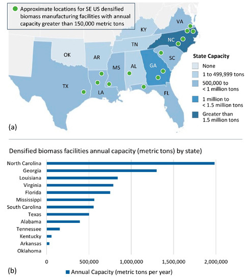 (a) SE US states and approximate locations of largest operating pellet mills; (b) annual operational production capacity by state reported by the US Energy Information Administration as operating in September 2020.