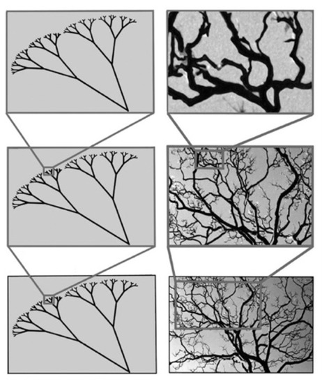 The branch patterns of an artificial tree repeat exactly at different magnifications (left column). In contrast, only the statistical qualities repeat for a real tree (right column).