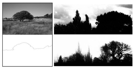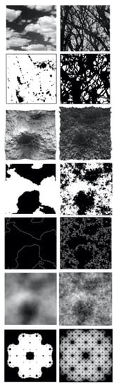 The images of Figure 3 capture the variety of our previously studied images. The top row are photographs of natural objects (clouds and forests). The 2nd row are Pollock paintings from different periods [37,38]. The 3rd row shows mathematically-generated geographical terrains viewed from above. These terrains are used to generate the images below them. To create the 4th row images, a horizontal slice is taken through the terrain and then any terrain above this height is colored white. This is referred to as the coastline pattern (white being land) and is used to create the 5th row images by coloring the coastline edges white. The grayscale images shown in the 6th row are created by converting the terrain heights at each location into greyscale values. The bottom row shows mathematical examples of exact fractals.