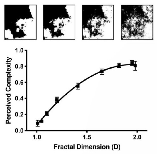 Perceived complexity increases with the fractal’s D value. Examples of computer-generated fractals quantified by D = 1.2, 1.4, 1.6, and 1.8 are shown above the graph.