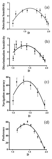 Performance tasks (detection (a), discrimination (b), and navigation (c)) and preference ratings (d) plotted against the fractal’s D value. Refer to the individual studies discussed in the text for details of the measurements and the relevant y-axis scale.