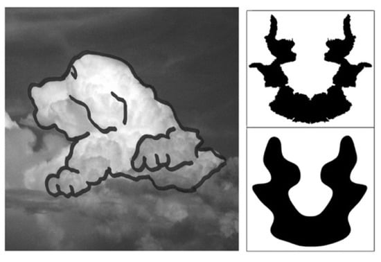 Left: Fractal clouds are renowned for inducing perceived images (as an illustration, a perceived dog is drawn on the photograph of a cloud). Right: an example ink blot (top) which induces fewer percepts when these edges are smoothed (bottom).