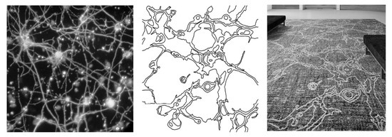 A second flooring design employed images of nature’s fractals—retinal neurons—as the starting point (Figure 12) [84]. These images were obtained as part of a research project which develops retinal implants to restore vision to patients with diseases such as macular degeneration [85]. Fluorescence microscopy was used to acquire detailed images of the retinal neurons in order to quantify parameters such as their D values (Figure 12 (left)). For the floor designs, the images were converted into grayscale versions and then contoured (Figure 10 (middle)). We initially expected to use software to manipulate the D values of the neuron contours but, fortuitously, the selected image’s D value of 1.7 fell within the D = 1.6–1.7 target range.
