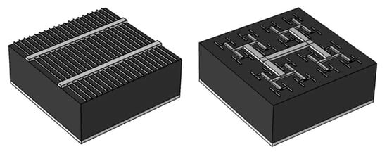 Inspired by this strategy of combining aesthetics with other favorable functions, a psychology-engineering project recently incorporated fractal aesthetics into solar panels (Figure 14) [87]. Because the electrical power increases with the panels’ surface area, the associated increase in visual impact will be critical for determining their success [88]. “Blended” panels have recently been introduced to neutralize the poor aesthetics of conventional designs. They cover the panels with camouflaging louvers which match the panels to their surroundings [89]. In contrast, rather than neutralizing their visual impact, our panels actively enhance the environmental aesthetics. This required the development of a hybrid electrode pattern which integrates a fractal design (based on the exact repetition of an H pattern shown in Figure 14 right) with the traditional solar panel design (the “bus-bar” shown in Figure 14 left). This novel hybrid electrode matches the electrical performance of bus-bars while promoting fractal aesthetics [87].