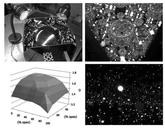 The photographs of the prototype apparatus (Figure 16) show a cube of mirrors and a central spherical mirror. By shining light through openings in the cube, we found that widening the openings reduces the chances of the light rays circulating around the cube and undergoing multiple reflections. This effect allows the fractal light pattern’s D value to be adjusted and so allows us to accommodate the individual observer’s aesthetic preferences [96]. These studies featured high fidelity mirrors to generate exact fractal reflections. Introducing random bumps into the sphere’s surface will result in the equivalent statistical fractals. We plan to install smaller versions of this apparatus around light fixtures to cast fractal light patterns throughout rooms. The apparatus can also be hung in front of windows to cast natural light which varies as the apparatus sways in the breeze.
