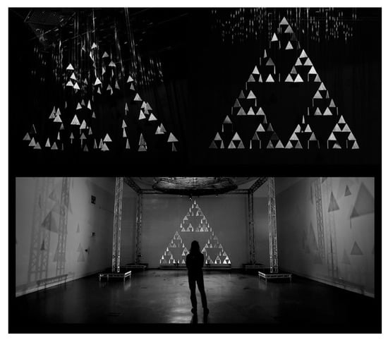 Finally, consider the use of dynamic patterns to create “virtual” fractals. Given that the repeating patterns can present a construction challenge, is it possible for the visual system to perceive fractals without them being physically assembled? Discussions with artist Richard Downing led to him creating The Fractal Clock (Figure 17). Based on the Sierpinski Triangle, Downing dangled a set of individual triangles (in one version they are made from glass, in another from slate) from cables attached to motors that allow the triangles to rotate at different rates. At a certain “resonance” time, all of the triangles align and the fractal is “assembled” in the observer’s mind (even though in physical space the triangles remain a set of disconnected objects that a person can stroll between). In addition to being a stunning artwork, The Fractal Clock serves as a reminder that creative solutions can be used to overcome physical limitations.