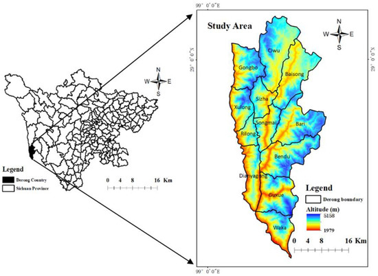 Derong County (99°07′ E to 99°34′ E, 28°09′ N to 29°10′ N) located in the southeastern edge of the Qinghai-Tibet Plateau and southwestern part of Sichuan Province, China (Figure 1). It is a principal ecological functional area in China and belongs to the Hengduan Mountains region, the most representative dry-hot valley region in China [39,40,41,42,43,44]. It belongs to the subtropical arid valley climate zone, with sufficient sunshine [39,40]. The average annual rainfall is 327.1 mm, and the annual average temperature is 14.8 °C. The annual average frost-free period is 243 d, the annual average sunshine time is 2200.7 h, and the annual average relative humidity is 46%. The river in Derong County belongs to the Jinsha River water system.