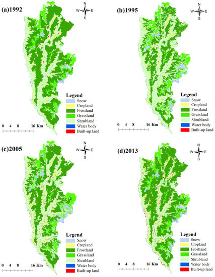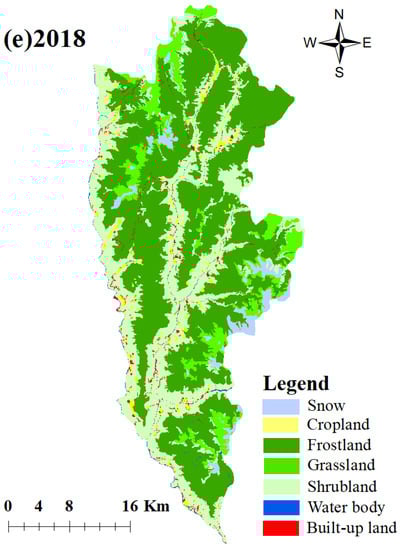 The results of land-use dynamics from 1992 to 2018 showed that shrubland and grassland decreased, with dynamics of −0.79% and −0.22%, respectively. The other land-use types increased, and the order of increasing speed was: Built-up land > cropland > snow > forestland > water body, with dynamic degrees of 11.31%, 1.75%, 0.94%, 0.44%, and 0.39%, respectively.