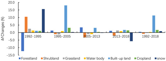 Single land-use dynamic (M) changes from 1992 to 2018.