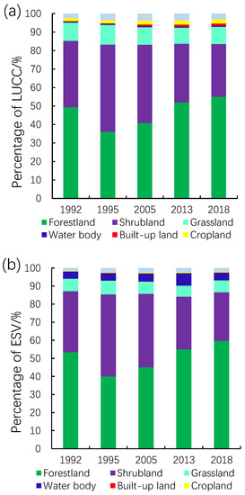The percentage of LULC and ESV of different land-use types. (a) Percentage of LULC, (b) Percentage of ESV.