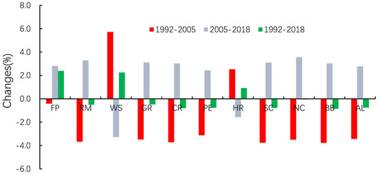 The change rate of ecosystem service function in Derong County from 1992 to 2018. FP, Food production, RM, Raw material, WS, Water supply, GR, Gas regulation, CR, Climate regulation, PE, Purify environment, HR, Hydrological regulation, SC, Soil conservation, NC, Nutrient cycle, BB, Biodiversity, AL, Aesthetic landscape.