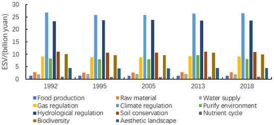 As can be seen from Table 4, from 1992 to 2018, climate regulation, hydrological regulation, soil conservation, and biodiversity contributed the most to the ESV, with a contribution of 71.34%, 71.51%, 71.53%, 69.56%, and 71.34%, most of ecosystem service functions decreased except food production, water supply, and hydrological regulation. From 1992 to 2005 and from 2005 to 2018, all individual ecosystem service functions showed the opposite trend (Figure 5).