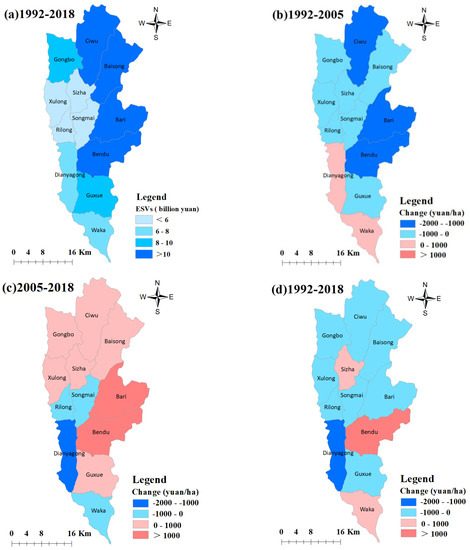 Spatial patterns of ecosystem service values (ESVs) (a) and changes in ESVs density at the townships region level during (b) 1992–1995, (c) 1995–2005, and (d) 1992–2018.