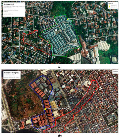 Examples of detected in-city resettlement sites with adjacent informal settlements marked in red: (a) Bistekville 2 in Quezon City and (b) Paradise Heights in Tondo, Manila. Source: Project team design (Megha Kanaginahal) in 2020, Satellite image: Google Earth 2020.