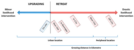 Upgrading–retreat continuum depicting the location types and their relation to livelihood intervention, distance, and urban services.