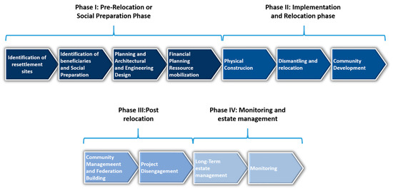 Resettlement is not a short-term process. As visible in Figure 3, it can be subdivided into three phases of project development, lasting, on average, more than one year and a fourth long-term phase for monitoring and estate management [40]. Phase I is the pre-relocation or social preparation phase. It consists of the identification of beneficiaries and resettlement sites, as well as the mobilization of resources [40]. It is a phase of intensive planning and negotiations, including calls for tender and bidding processes, and can entail very bureaucratic processes whereby the principle applies that more bureaucratic hurdles of legal and administrative issue exist for near-city and off-city projects because at least two local authorities, the sending and receiving LGUs, are involved. Additionally, the more intense the participation is, the longer phase I is. For example, the building of associations in community-driven approaches is a complicated process. Further complicated is the identification of sites in these community-driven projects, particularly because they mainly focus on the rare near-site, in-Barangay, and in-city sites.