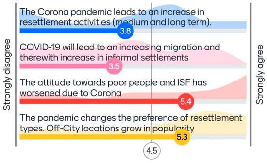The performed real-time validation tasks of the second stakeholder workshop could have revealed the experts’ opinions on the question regarding which poor population groups have suffered most from the coronavirus and lockdown impacts. The experts identified the people living in informal settlements as those who were hardest hit, followed by people in in-city resettlement sites. The people in peripheral near-city or off-city locations were ranked as least severely hit. According to the experts, the lockdown was not as directly enforced and felt in off-city locations, where people could move more freely. However, whereas the direct effects were estimated to be less dramatic in off-city projects, the experts also highlighted the danger of secondary effects, including the interruption of important urban–rural linkages and the limited accessibility of critical services. This might include access to food and goods, as well as health facilities.