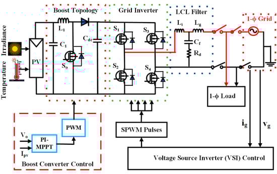 Figure 1 shows a designed topology for a PV array. The topology comprises five interconnected branches: PV panel, MPPT controllers with PI controllers, a DC/DC boost converter, a 1-φ DC/AC bridge inverter and a low-pass filter (LCL), and a utility grid.
