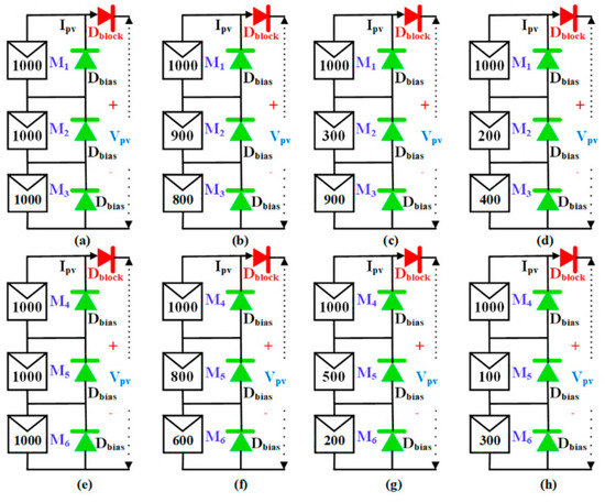 This unequal distribution of solar irradiance between the PV modules is called PSC. Thus, a shaded module overheats, creating power losses, and could damage the entire PV array. The hotspot condition from a specific module can be eliminated by connecting a bypass diode in parallel with each PV module. Figure 4 shows two uniform weather and six shaded conditions to help readers understand the real scenario of the PSC. Figure 4a–d and Figure 4e,f show shading patterns for the simulation and experiment, respectively. In each PV string, a blocking-diode denoted in red color is used to control the flow of reverse current and protect the battery from damage. These eight different irradiance profiles are used to test the tracking performance of the MPPT algorithms. The maximum power (213.6 W) of a PV model for experimental analysis is approximately seven times less than the power (1497 W) of the simulation system, because of the limited power supply from the Agilent solar simulator.