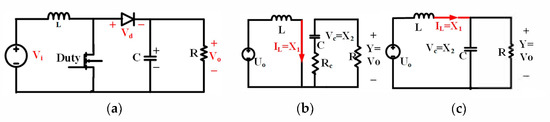A DC/DC boost converter and its functionality: (a) boost converter configuration; (b) ON state of the converter; (c) OFF state of the converter [31].