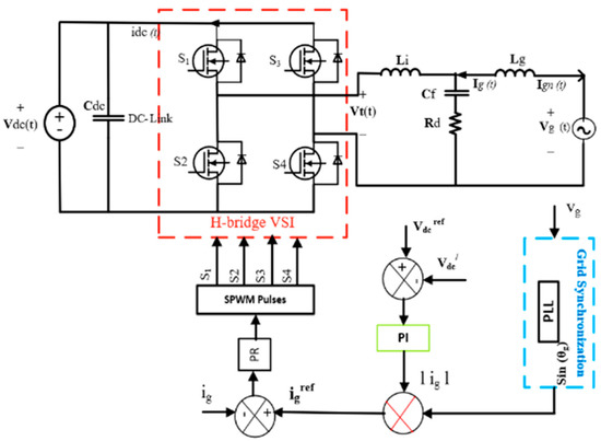 To implement the traditional automatic synchronization technique, the VSI inverter should have a similar line voltage and current with a matched phase and frequency similar to those of the grid system [32]. Robust control methods are applied in synchronization to quickly identify the frequent changes in voltage, phase, and frequency magnitudes, and maintain the status quo of the grid [33]. The grid synchronization method is advantageous in two major ways. Firstly, a grid synchronizer not only reproduces a filtered signal that is in phase with grid voltage but also emulates an orthogonal component of the grid voltage, which can be used to generate reactive power reference to the inverter. Therefore, the inverter gains the ability to control the reactive power flow compared to the conventional inverters that only transfer active power due to their inability to produce an orthogonal component of the current reference. Secondly, to lock on the phase of the grid voltage, SRE-PLL would need a zero-voltage crossing detection to reset the integrator and the d-q transformations used, which would need sine and cosine calculations. A 1-ϕ feedback current loop is used to regulate the grid current. A proportional resonant (PR) compensator is used to track a sinusoidal current reference signal. To remove harmonic components, obtain balanced conditions, and maintain the same phase of the input and output signals of the grid, a synchronous reference frame (SRF)-PLL is deployed in the VSI control technique. A PR controller in the SRF-PLL method is applied for a faster and more robust process than that of others because it does not need decoupling and intermittent operations shown in Figure 6.