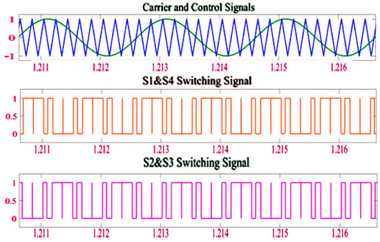 Table 2 gives the VSI and LCL filter specifications A simple bipolar SPWM modulation technique is chosen to generate the complementary pulses at the same switching frequency of the VSI [34]. In the bipolar SPWM control, the switch pairs, S1-S4 and S2-S3 of the VSI, are turned ON and OFF, respectively. The amplitudes at the positive and negative sides of the generated square pulses of the SPWM method are equal in magnitude with opposite polarity. The output voltage shifts between +VDC and −VDC voltage levels. The frequency of the carrier wave is chosen as 10 kHz and the frequency of the sine wave is 50 Hz (fundamental frequency). In the bipolar control technique, the two switching signals are shown in Figure 7.