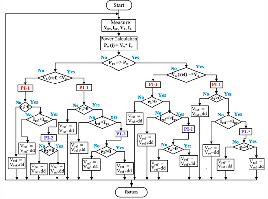 This proposed method finds a true GMPP of the PV modules by iteratively perturbing the converter input current and output voltage, and comparing the power (Ppv) generated by the PV module with the output power of the boost converter (Po) (Figure 8). The voltage and current perturbations are achieved through the changes in the duty cycle D. The error sign (ΔP = Ppv − Po) is used to determine the direction of the perturbation. The voltage error (ΔV) is the difference between the output reference voltage (Vo,ref) and the measured voltage (Vo) of the boost converter. If the power and voltage differences together are greater or equal to zero (ΔP ≥ 0 and ΔV ≥ 0), PI-1 is activated to reduce an error e1. Then, PI-2 is operated to minimize e2 error (ΔI = Pref − Ipv) and the duty cycle should be increased to produce a constant output power of the converter. The input reference current (Iref) and output reference voltage (Vo,ref) of the boost converter are chosen to be 8.14 A and 325 V for simulation work, respectively. This algorithm can reverse the perturbation when power decreases, and this process repeats until the MPP of the PV module is reached. If the system reaches GMPP, the algorithm produces a steady value of the duty cycle. To increase stability, the oscillation around the MPP of the PV module must be zero, thus the duty cycle perturbation is stopped when ΔP is zero or equal to a present smallest value.