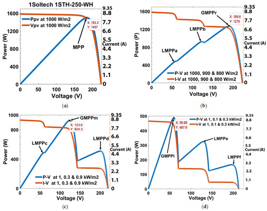 - Figure 9d: PV modules; M1, M2, and M3 are designed to receive 1, 0.2, and 0.4 kW/m2 with an approximate value of GMPPl being 0.488 kW. Other than the GMPPs, two LMPPs (LMPPe and LMPPf) occurred on the P-V curve because of an unequal current flow across each PV module.