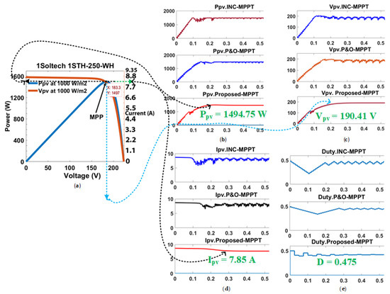 Simulation results of INC, P&O, and Coordinated PI-MPPT algorithms at STC are listed as: (a) STC waveforms; (b) power; (c) voltage (d); current; and (e) duty cycle waveforms.