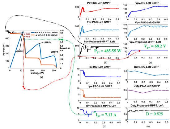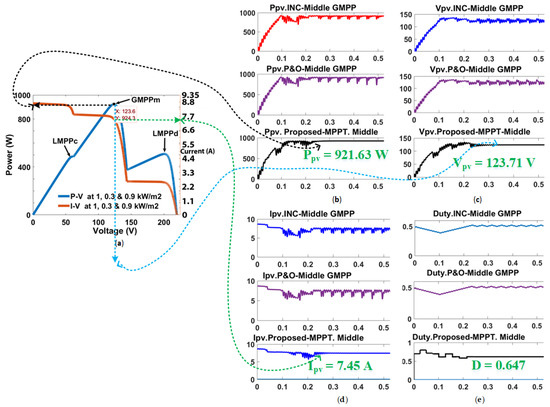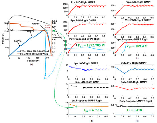 Figure 11b–e show the results of comparative analyses of power, voltages, currents, and duty cycles between the MPPT methods. These waveforms are drawn from the shading pattern 1 in which the GMPP location is on the right side of the PV curve. The proposed technique tracks the right GMPP because the searching process enables the rapid convergence of the operating point toward GMPP.