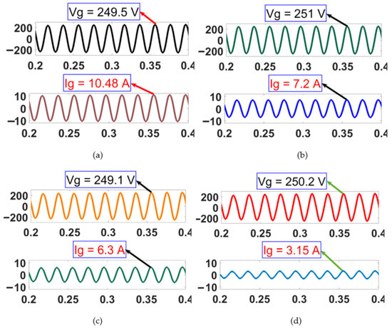 Figure 21a–c show the voltage and current waveforms of the unity-powered utility grid when DC power is fed by the VSI in the uniform, right, middle, and left shaded P-V curves. These waveforms are directly interfaced with the scaled-down power grid because they do not show unexpected ripple components and THD.