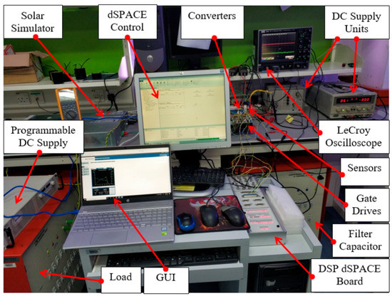 To analyze the tracking speed, convergence time, and power oscillations against the shaded illumination levels, a series-connected PV module (Model Atlantis Energy Systems SS125LM) was used to build the PV array in both the solar array simulator (SAS) and table modes of Agilent solar simulator. A low-power (213.33 W at STC) PV module was chosen because of a limitation in the power configuration of the simulator. A dSPACE board, MATLAB software, and the solar simulator were interfaced with the proposed topology to generate a PWM signal in controlling converter switch at 10 kHz frequency. The dSPACE controller was also used to sense current and voltage from the boost converter through the analog-to-digital (ADC) converter ports, triggering the waveforms. Figure 15 shows a scaled-down prototype of an experimental setup comprising a digital oscilloscope (LeCroy), DC power supply units, DC/DC boost converter, DSP dSPACE board, gate drives, sensors, filter circuits, solar simulator interface, and load. Furthermore, the hardware schematic and design parameters were analyzed through the experimental setup under uniform and shaded conditions. These results were then compared with PI-P&O and PI-INC algorithms. The conventional and proposed MPPT schemes were evaluated for shading pattern 1 (five modules per string in each series-connected panel at 1, 0.8, and 0.6 kW/m2), pattern 2 (five modules per string in each series-connected panel at 1, 0.5, and 0.2 kW/m2), and pattern 3 (five modules per string in each series-connected panel at 1, 0.1 and 0.3 kW/m2).