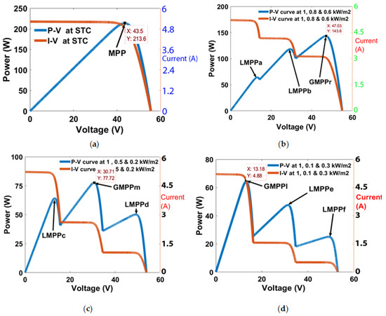 Figure 16a shows the P-V and I-V characteristics curves in which each PV module is operated to STC weather (1000 W/m2 and 25 °C) condition. Hence, the PV array generates a single MPP coordinate (43.5 V, 213.6 W) on the P-V curve. Figure 16b demonstrates a GMPPr (0.144 kW) and two corresponding LMPPs (LMPPa and LMPPb) occurred on the P-V curve at shading pattern 1. Figure 16c depicts P-V and I-V graphs for shading pattern 2, consisting of a GMPPm (0.078 kW) and two other local MPPs (LMPPc and LMPPd). Figure 16d shows an approximate value of GMPPl being 0.064 kW, and two LMPPs (LMPPe and LMPPf) that occurred on the P-V curve because of an unequal current flow across each PV array. These uniform and shading patterns are regenerated in the solar simulator to verify the performance of the MPPT algorithms in the experimental environment.