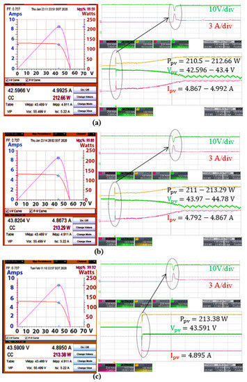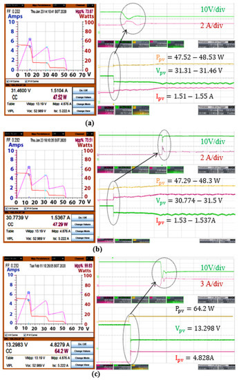 Experimental results under STC: (a) INC-MPPT; (b) P&O-MPPT; and (c) proposed MPPT.