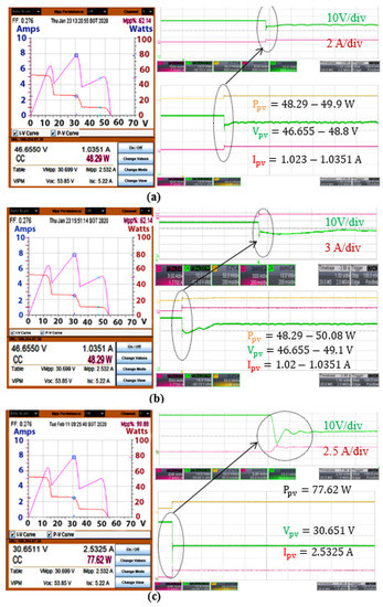 Figure 20a–c illustrates the experimental results of the conventional and proposed MPPT schemes for shading pattern 3. In this shading pattern, GMPP, LMPP1, and LMPP2 comprise 64.34, 47.63, and 25.08 W in descending order, while voltages are held at 13.18, 31.31, and 48.98 V, respectively.