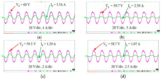 The sinusoidal grid current and voltage waveforms are taken from the SSC by neglecting the transient period of the system. Figure 21a shows the grid current (Ig) is in phase with grid voltage (Vg), maintaining unity power factor and supplying power to the grid with 3.56 A at uniform weather condition. Figure 21b shows the output power of the VSI reduces at shading pattern 1, because of the current decreases by 1.17 A, and maintaining the grid voltage of 59.7 V. Similarly, Figure 21c–d show the grid currents and voltages are 59.3 V and 58.7 V, and 1.29 A and 1.07 A, respectively, under the shading patterns 2 and 3. The experimental and simulation outcomes of the VSI are verified because the same phase and frequency of the grid parameters are obtained from both comparative studies.