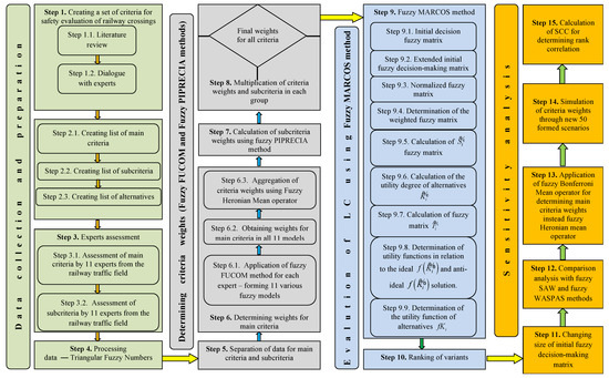These are only some of the problems that manifest themselves in the field of traffic safety since they usually arise under the influence of a number of criteria that are not correlated. Considering the above, and the importance and relevance of the field of research, the following goals of the paper stand out. The first goal is the need to form a model for evaluating safety at level crossings and the possibility of forming a set of measures to improve the situation. Further, the second goal involves the development of a novel integrated fuzzy FUCOM (full consistency method; based on a fuzzy Heronian mean operator)–fuzzy PIPRECIA (pivot pairwise relative criteria importance assessment)–fuzzy MARCOS (measurement of alternatives and ranking according to compromise solution) model as a contribution to multi-criteria decision-making processes. The third goal of this paper is to create a novel integrated model for determining the significance of the criteria. All the above mentioned aims describe the originality of the developed integrated fuzzy model, its importance, and achieved contribution of the paper. The advantage of the developed integrated fuzzy FUCOM–fuzzy PIPRECIA–fuzzy MARCOS model is the fact that the created model eliminated the possibility of inadequate ranking compared to similar approaches as we stated further through the paper.