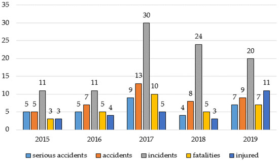 The analysis of serious accidents, accidents, and incidents, with killed and injured persons at level crossings in BiH in the last five years is shown in Figure 4. It can be seen that there are variations in the number of accidents in the last five years and that in 2019 there was the largest number of injured persons, while the number of incidents decreased compared to the previous two years.