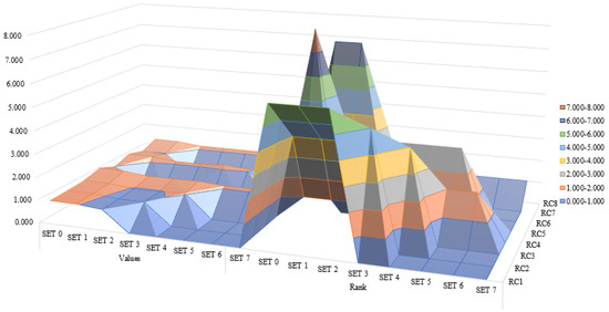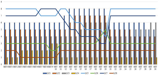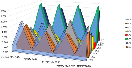 Figure 6 shows the values (left) and ranks (right) through the formed scenarios in terms of the size of the fuzzy rank of the initial decision matrix. It can be observed that the dynamic conditions of the fuzzy matrix affect the results. Specifically, in the first four scenarios when LC5, LC7, LC1, and LC2 were eliminated, respectively for each scenario separately, there was no change of ranks compared to the initial rank. When it comes to scenarios S5–S7, one change occurred when the first and second best alternatives changed their positions, which was caused by eliminating the third alterative solution LC3.