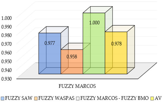As can be seen in Figure 8, previous discussion is proven, where WS coefficient has values 0.977 (Fuzzy SAW), 0.958 (Fuzzy WASPAS), and 1.000 (Fuzzy MARCOS–Fuzzy BMO) which show extremely high correlation in ranking alternatives.