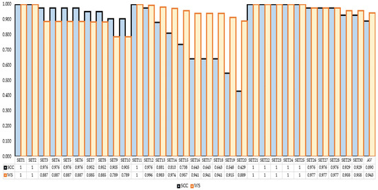 Figure 10 shows a statistical correlation—SCC [34] and WS [33,35] of the initial rank results in relation to 30 scenarios in which the weight values of the criteria have been changed. A total correlation was observed in a total of eight scenarios out of 30 (SCC = 1.00). In the same number of scenarios, the SCC was 0.976, which means that there is a change in the ranks of the alternative solutions. In two scenarios (S7 and S8), SCC = 0.952, which means that there were two changes in ranks, while the value of the correlation coefficient was 0.929 in three scenarios. In other scenarios, the value of SCC was significantly lower and ranges 0.429–0.905, which means that there was a low correlation individually in some scenarios. In general, if all correlation coefficients are taken into account and the average SCC is calculated, it can be seen that the ranks were still highly correlated (SCC = 0.890). WS coefficient showed different values than SCC depending on rank changes because positions at the top of the ranking have a more significant impact on the similarity than those further away. For example, if we consider the third scenario where the two best alternatives changing their places, WS is less than SCC for 0.089 (SCC = 0.976, WS = 0.887). On the contrary, if we consider scenario 20 which has more changes in ranks, but not for best alternatives, WS has much higher value than SCC (SCC = 0.429, WS = 0.889). In general, if all correlation coefficients are taken into account and the average WS is calculated, it can be seen that the ranks are very highly correlated (WS = 0.943).